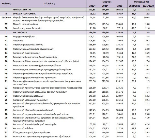 - Ο γενικός δείκτης βιομηχανικής παραγωγής, σε σύγκριση με τον Μάρτιο του 2021 (ετήσια μεταβολή), παρουσίασε αύξηση κατά 7,9%.