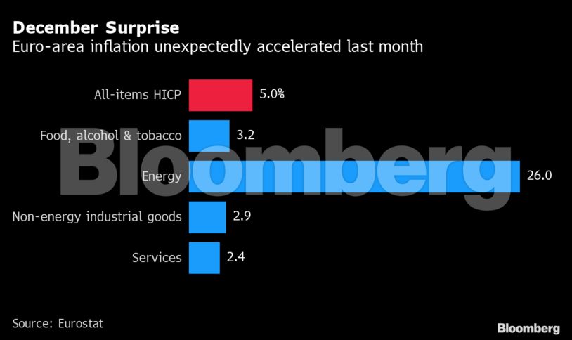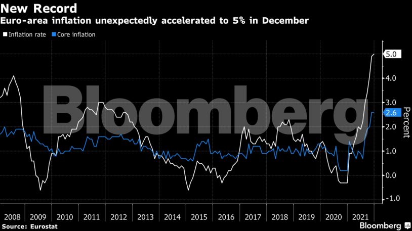 Οι τιμές καταναλωτή το Δεκέμβριο του 2021 κατέγραψαν άνοδο της τάξης του 5% σε σχέση με το Δεκέμβριο του 2020, μεγαλύτερη από την αύξηση του 4,9% του Νοεμβρίου και από την αύξηση του 4,8% που ανέμεναν οι αναλυτές.